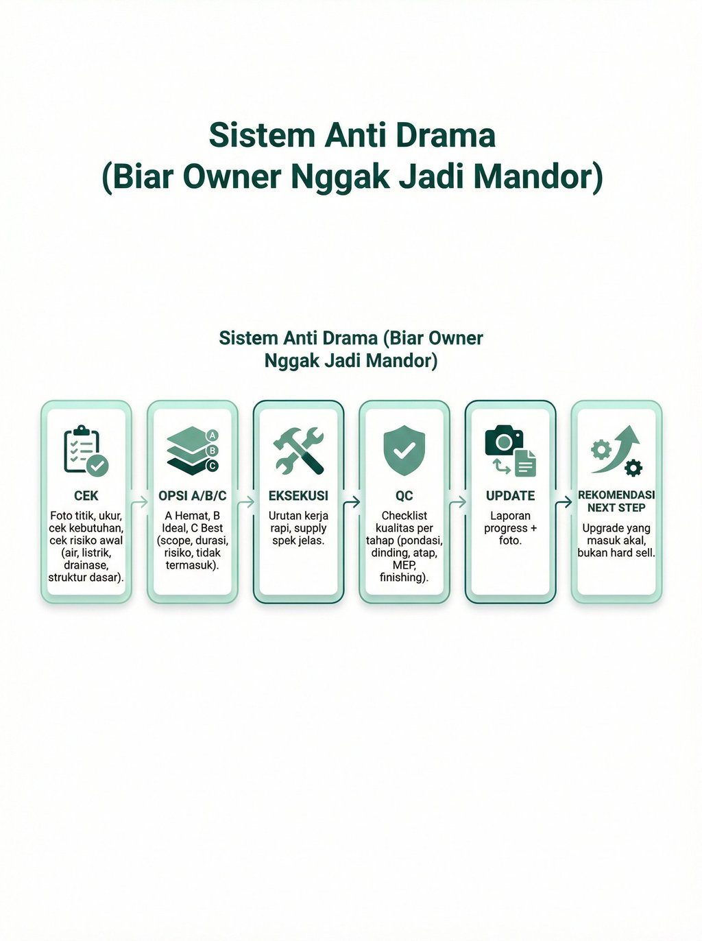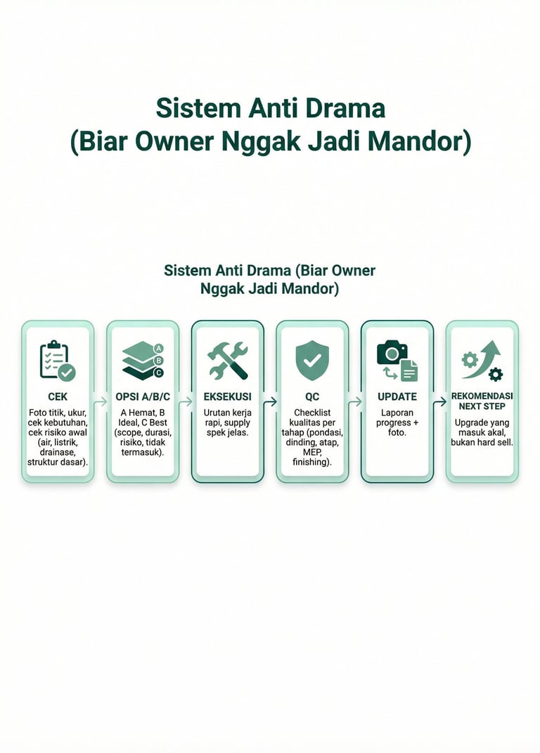 Target: jadi cepat, fungsi jalan, rapi cukup, risiko terkontrol (bukan mewah).