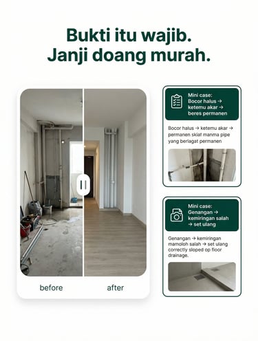 Kamar mandi: waterproofing + slope drain + detail nat & sealant premium