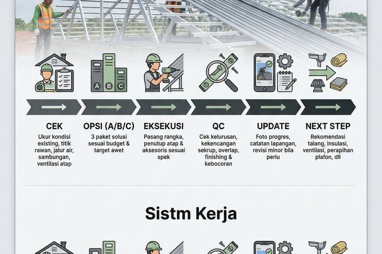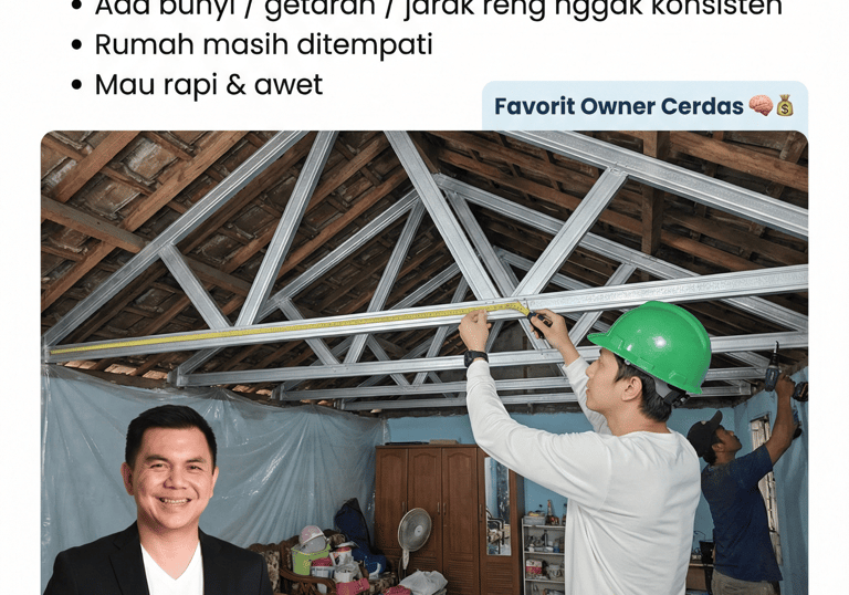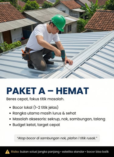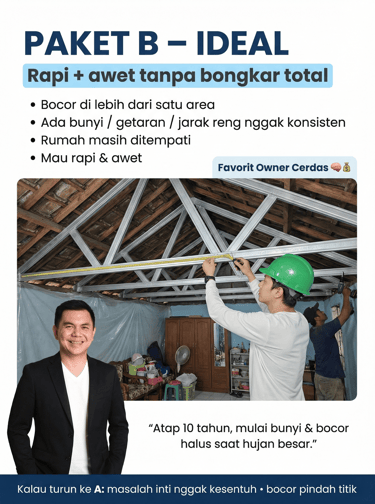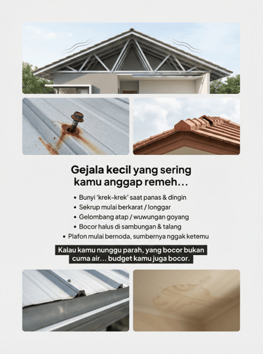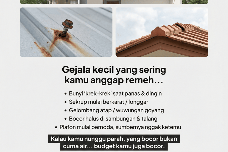 “Atap rumah 10 tahun, mulai bunyi & bocor halus pas hujan gede.”
